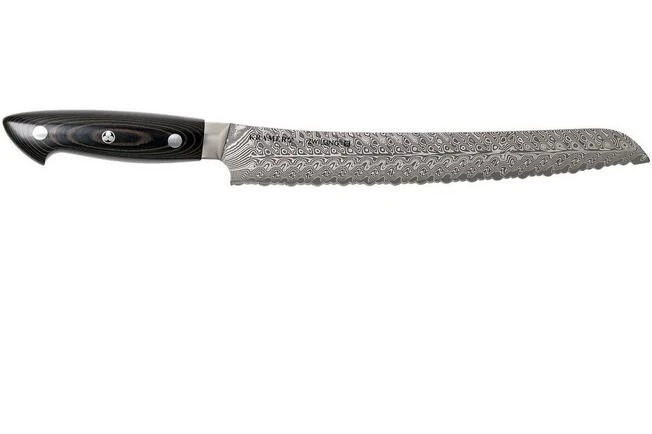 The Bob Kramer by Zwilling Euro Stainless bread knife impresses with the stunning pattern on the blade. The knife effortlessly cuts through different types of bread. Even bread that has a hard crust is no match for this knife because of the special serrations and the fine edge. This, however, doesn’t mean that you can only use this knife for bread. After all, you can also use this knife to cut cakes and pies but also hard types of fruit or vegetables.