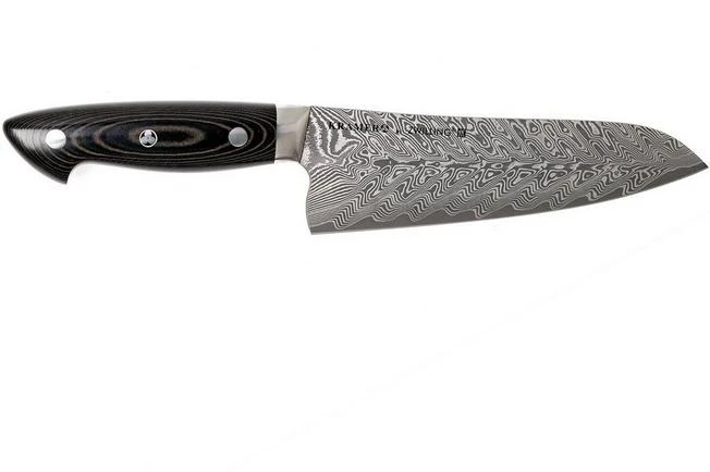The Bob Kramer by Zwilling Stainless Essential Santoku knife impresses with the stunning pattern on the blade. A little lighter and more compact than a chef’s knife. The knife effortlessly cuts through vegetables, fruit, meats and fish. Cut, crush and scoop. It is all possible with the multifunctional Santoku.