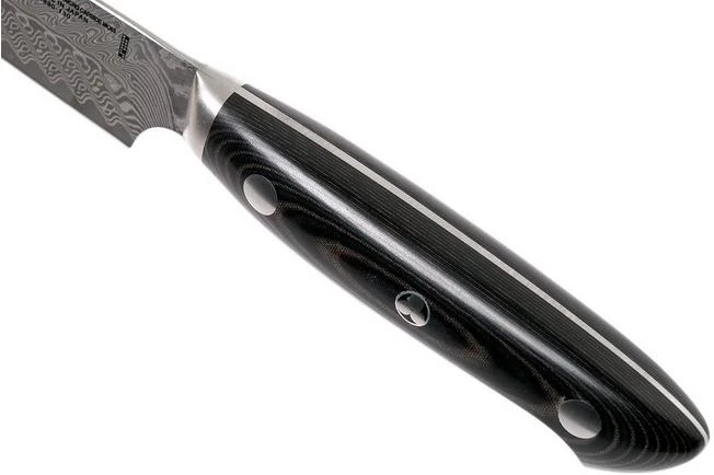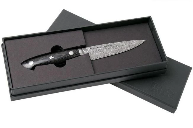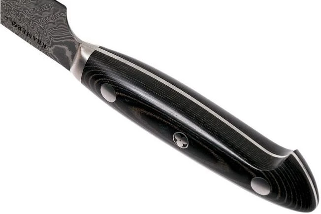 The Bob Kramer by Zwilling Euro Stainless utility knife, 13 cm has a slim, long blade and can be used for various cutting jobs. The blade has a slight curve that ends in a pointed tip. As such you can rock the knife to chop herbs. You use the tip for the more detailed jobs. Anything that can’t be done with a chef’s knife because it is a little too big, can be done with this utility knife. Whether you need to cut cheese, sausage or finely chop herbs.