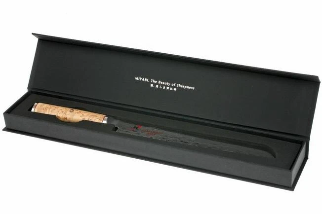 The Miyabi 5000MCD bread knife 23 cm comes from the Zwilling J. A. Henckels factory in Seki, Japan. Striking are the ergonomically shaped handle with Masur birch D-shape and the beautiful drawing of damask steel on the blade.