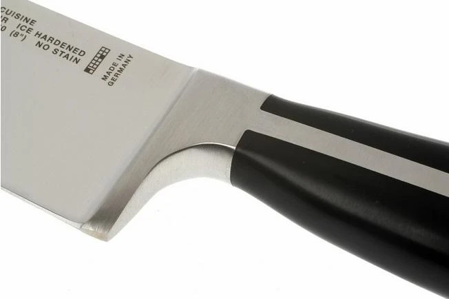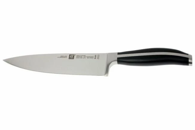 The Twin Cuisine knives have, like many other kitchen knives, a full tang blade: the blade runs entirely through the handle. In this award-winning design, the blade runs horizontally through the black plastic handle. Which is therefore very beautifully interrupted. That handle is seamless and attached to the blade without rivets. The handle feels very comfortable. The bolster of the blade provides a good balance and protects your index finger, which logically falls behind the curve and therefore will not accidentally slip and hit the edge.