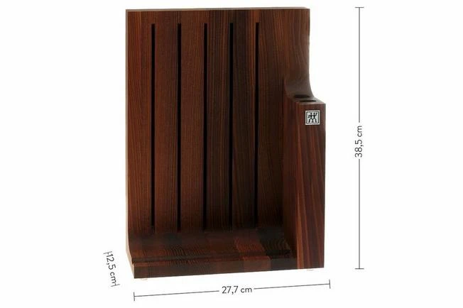 This Zwilling Twin 1731 knife block from burned wood has enough room for five knives, a pair of scissors and a honing steel. The slots of the block are enhanced with magnets to make sure the knives stay in place. You don’t see the magnets, but your knives will always stay in place. Because of the luxurious look and feel of this block it will be a real asset to any kitchen. Keep in mind that only knives with a blade length up to (approx) 35 cm fit inside this block.