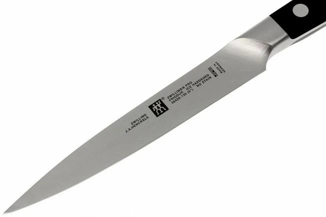 The kitchen knives from the Pro collection are enhanced with a blade that is forged from one piece of steel. The full tang blade seamlessly merges with the plastic handle. The handle is secured to the steel with three rivets. The transition between the handle and steel is seamless. No dirt can accumulate in between. These knives are enhanced with a classic design and appeal to those who prefer heavier knives.