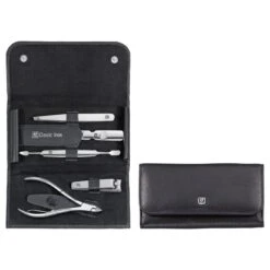 This pocket case with press-stud flap ensures personal hygiene both at home and while travelling. The 14.5 x 7.6 cm case is made of black leather, which is not only pleasing to the eye, but also of excellent quality. The useful press-stud flap ensures you can close it securely. Putting the case away in the bathroom cabinet or a toilet bag is no problem because of its small and handy size. The five-piece set stands out thanks to its high-quality equipment. All its instruments are made of polished stainless steel, so they retain their high-quality surface finish, even in humid environments. The set consists of nail clippers, a sapphire nail file and a dual instrument that combines both a nail cleaner and a cuticle pusher. Tweezers as well as cuticle nippers are also included. Personal hygiene is even more fun with the leather pocket case from the ZWILLING® Classic Inox series.