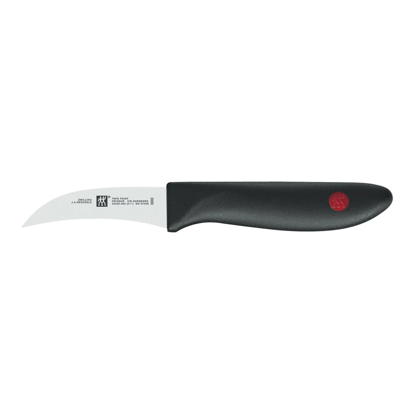 The peeling knife from the TWIN® Point series is small, lightweight and easy to use, cutting and peeling fruit and vegetables effortlessly, and saving you valuable time in the kitchen. This knife is also ideal for transforming fruit and vegetables into decorative shapes to garnish your food. Its 6 cm-long FRIODUR® blade is slightly curved and is made of corrosion-proof stainless steel incorporating an optimum mix of carbon and chrome. The blade also has an additional ice-hardened finish to ensure that this peeling knife stays sharp for longer. Its non-slip plastic handle sits comfortably in the hand making it practical to use and its ergonomic shape makes working with this knife a thing of pleasure. It is comfortable to hold and safe to use. This knife is easily recognisable by the red dot in the handle incorporating the ZWILLING logo. By choosing this ZWILLING peeling knife you are opting for a hard-wearing, durable and reliable implement to simplify cutting work in the kitchen.
