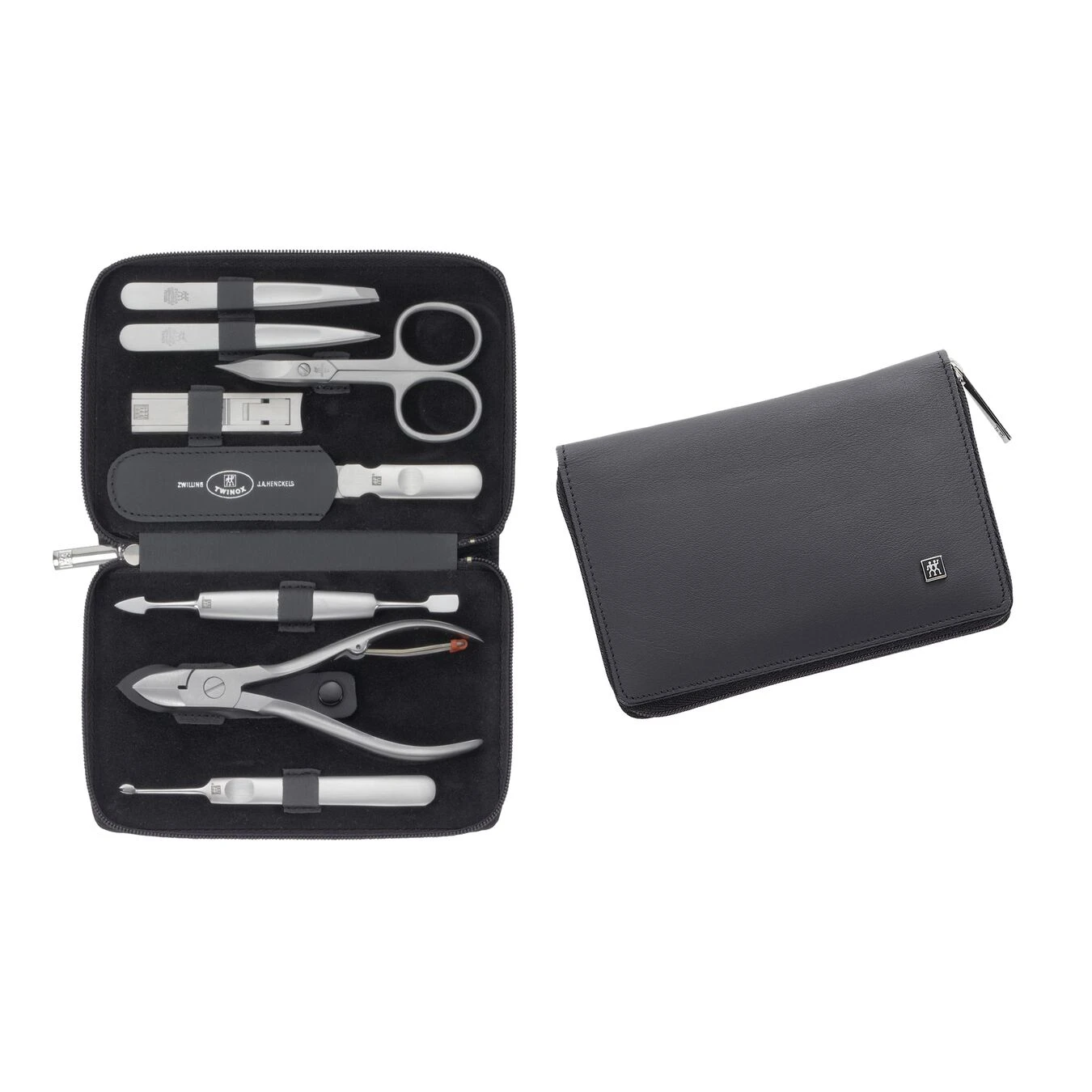 This elegant zip case contains sharp, gentle instruments for nail care. The precision-manufactured instruments are made ​​of stainless steel. ZWILLING scissors have a smooth action and cut up to the tips. The high-quality tools consist of combined nail scissors, a sapphire nail file, a cuticle pusher, a twin instrument, one pair of pointed tweezers and one slanted pair, nail clippers and a nail nipper. At 14 x 10 cm, the 8-piece zip case is large enough for those who require a regular manicure with tools, scissors and file always at hand. All tools in the range show first-class workmanship. Thanks to the satin stainless steel, use is even recommended in high humidity. Corrosion-resistant, practical and durable, the manicure set is of the highest quality and high functionality. Only high-quality steel is used as raw material and the surface boasts a clean finish of the edges. With the nail care set of the TWINOX® manicure set range you will be well equipped even when out and about.