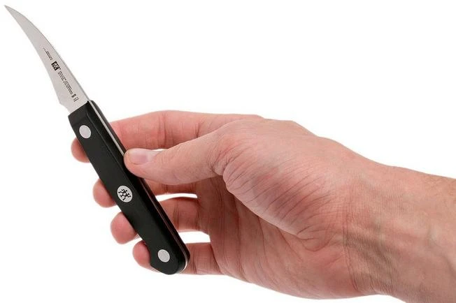 The Zwilling Gourmet turning knife/peeling knife is perfect when peeling. vegetables, fruit and potatoes. The short blade has a slightly curved shape that perfectly matches the curve of, for instance, apples or potatoes. In addition to peeling and cutting jobs this knife is also great when removing rotten spots thanks to the sharp tip. The knife is a part of the Zwilling Gourmet collection. An extensive collection of kitchen knives with a classic three-rivet design.