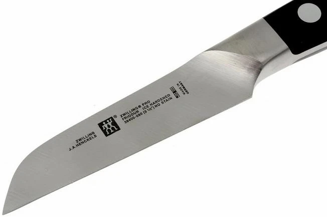 The kitchen knives of the Pro series by Zwilling have a blade that is forged from 1 piece of steel. The blade runs entirely in the plastic handle: a ‘ full tang ‘ construction. The handle is attached to the steel with 3 rivets. The transition between handle and metal is seamless. This means no crack which collects dirt. These knives have a classic design and are particularly attractive to those who love a heavier type of knife.