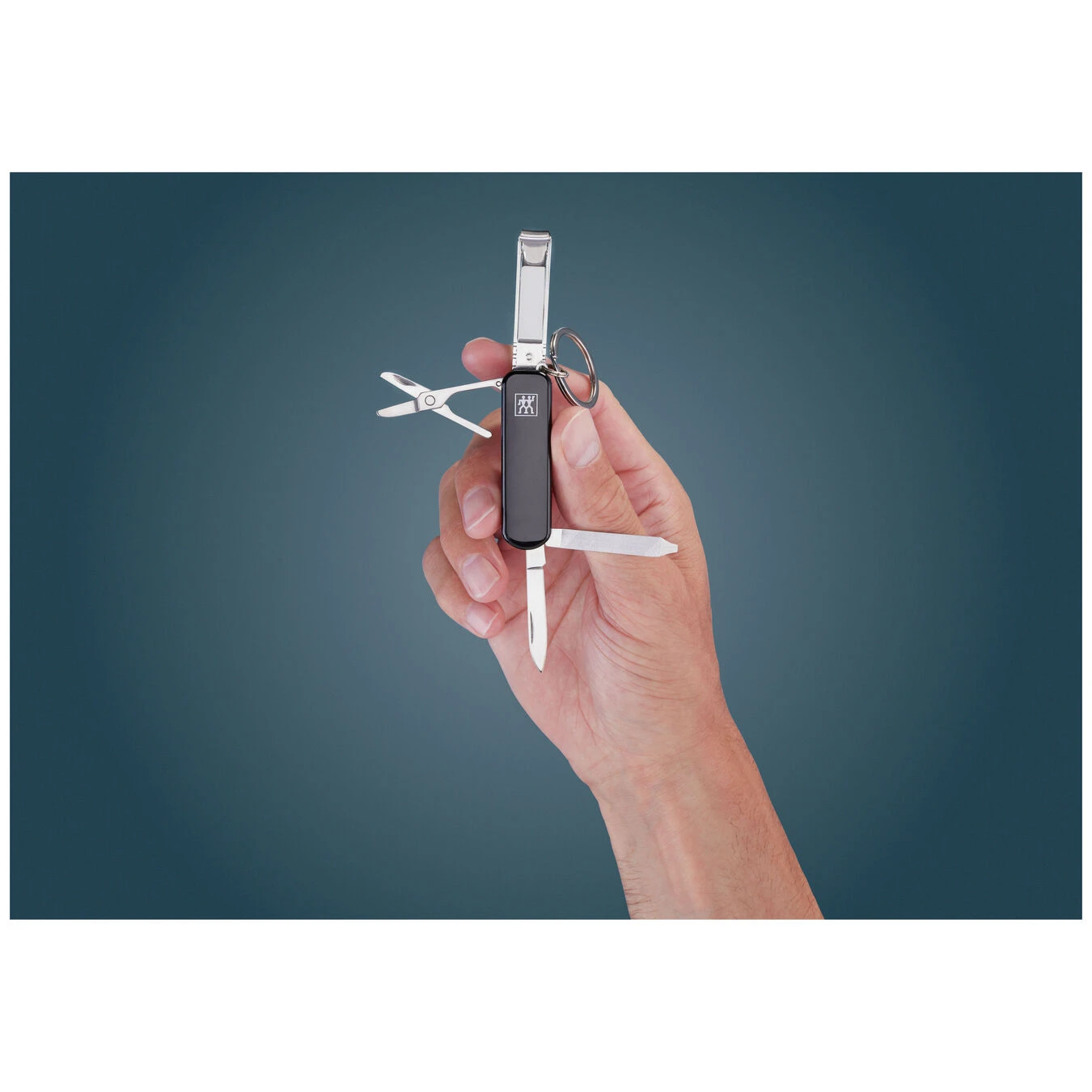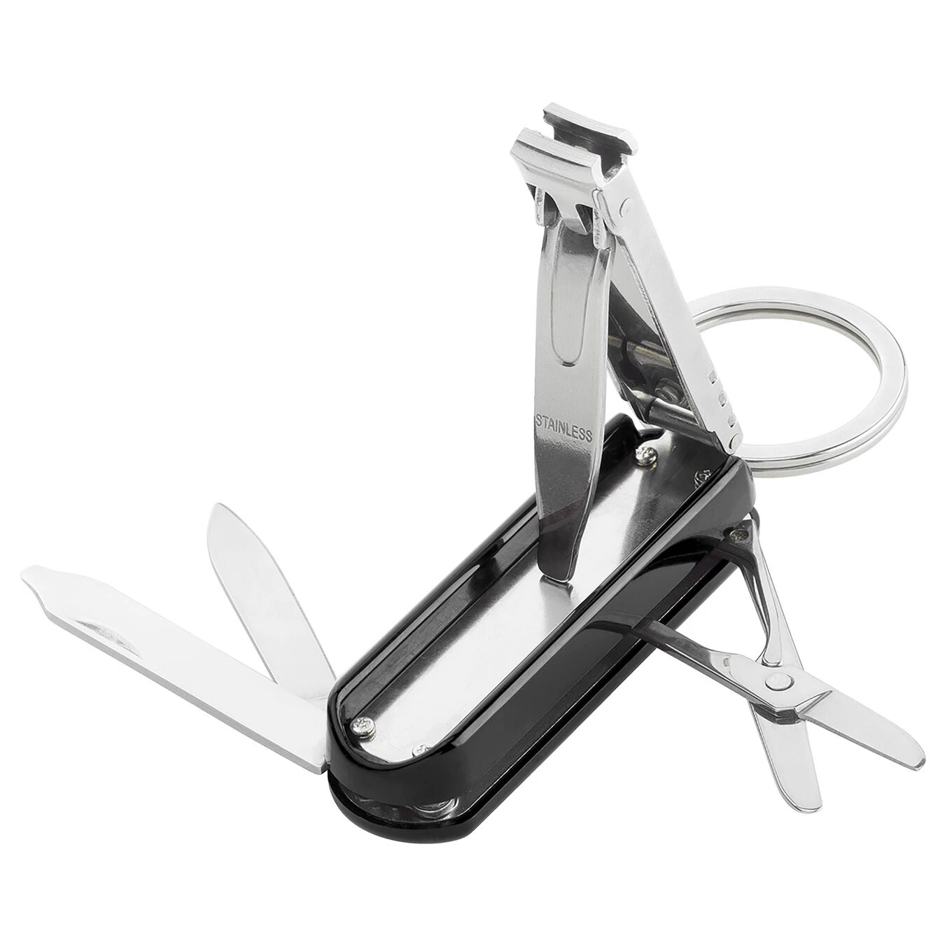 - Multi-tool with nail clipper, nose and ear hair scissors, nail file with nail cleaner and pocket knife made of stainless and polished steel